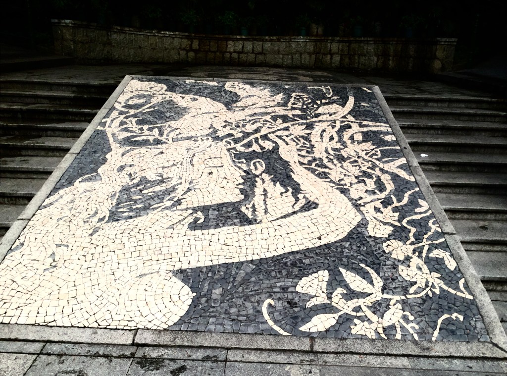 Calçada Portuguesa is the term for paved black and white street mosaics. These mosaics made with limestone-basalt can be seen all over the city streets they are a reminder of the Portuguese Governance. Macau was a European colony (under Portugal) for over 400 years! Todays Calçada has undergone symbolic regeneration and some imagery now portrays iconography distinct to Macau.