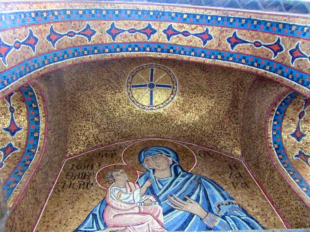 The arched entrance to the Agioi Theodoroi Greek Orthodox Byzantine Church. This dazzling mosaic glitters with gold leaf and is sure to welcome you to the stunning church.
