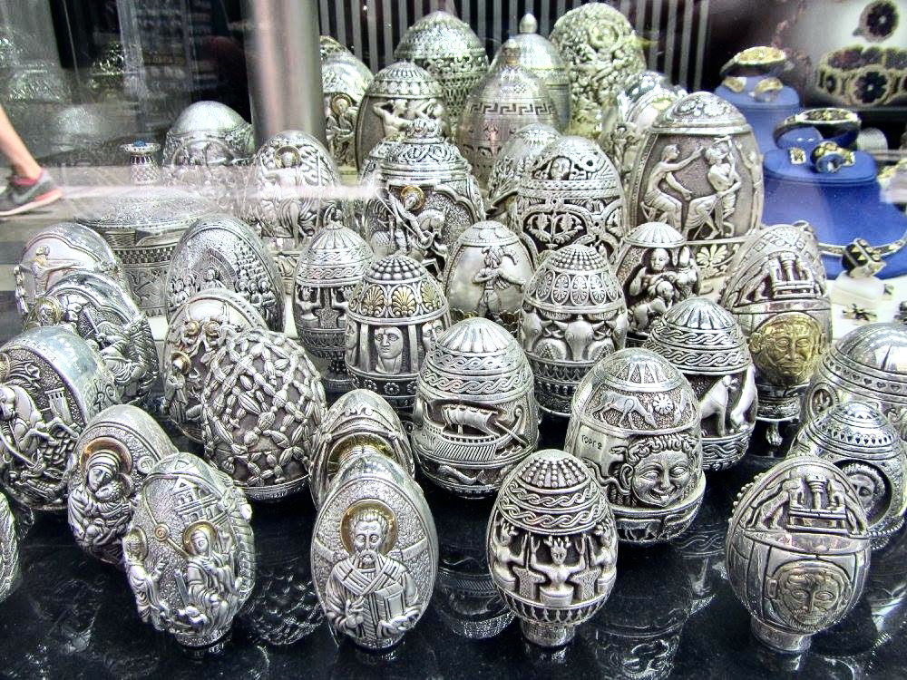 Silver eggs have mythical roots in Grecian history its believed that Chronos (the personification of time) created the silver egg of the universe. Today, beautifully carved silver souvenirs adorned with patterns, animals, and religious imagery can be found in specialty shops all over Athens.