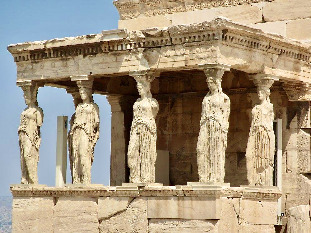 The Caryatid Porch on the Erechtheum Temple at the Acropolis. There are six elegant female sculptures supporting the ceiling.