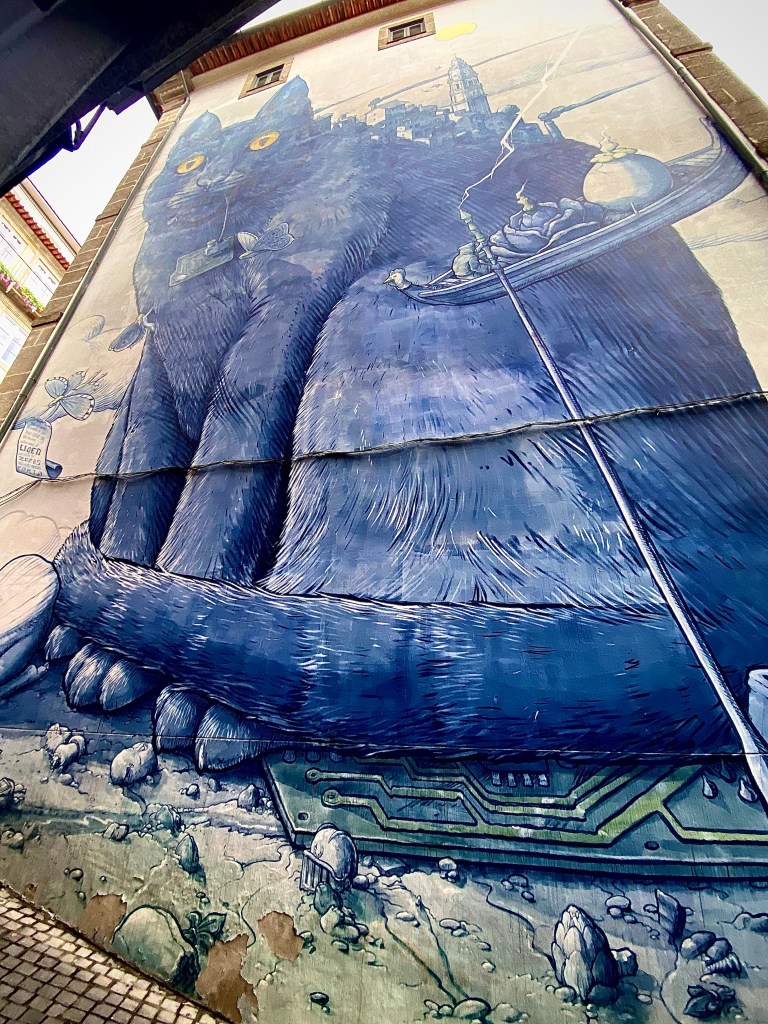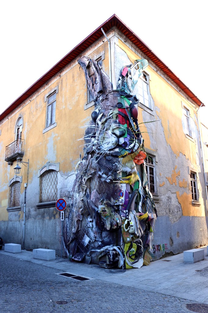 A towering commentary on human consumption, this three dimensions sculpture clings to the facade on a street corner. Composed of recycled trash the rabbit poses still half colorful and hopeful to the future and half dark and ominous. It can be found down a quiet street in Gaia, Portugal.