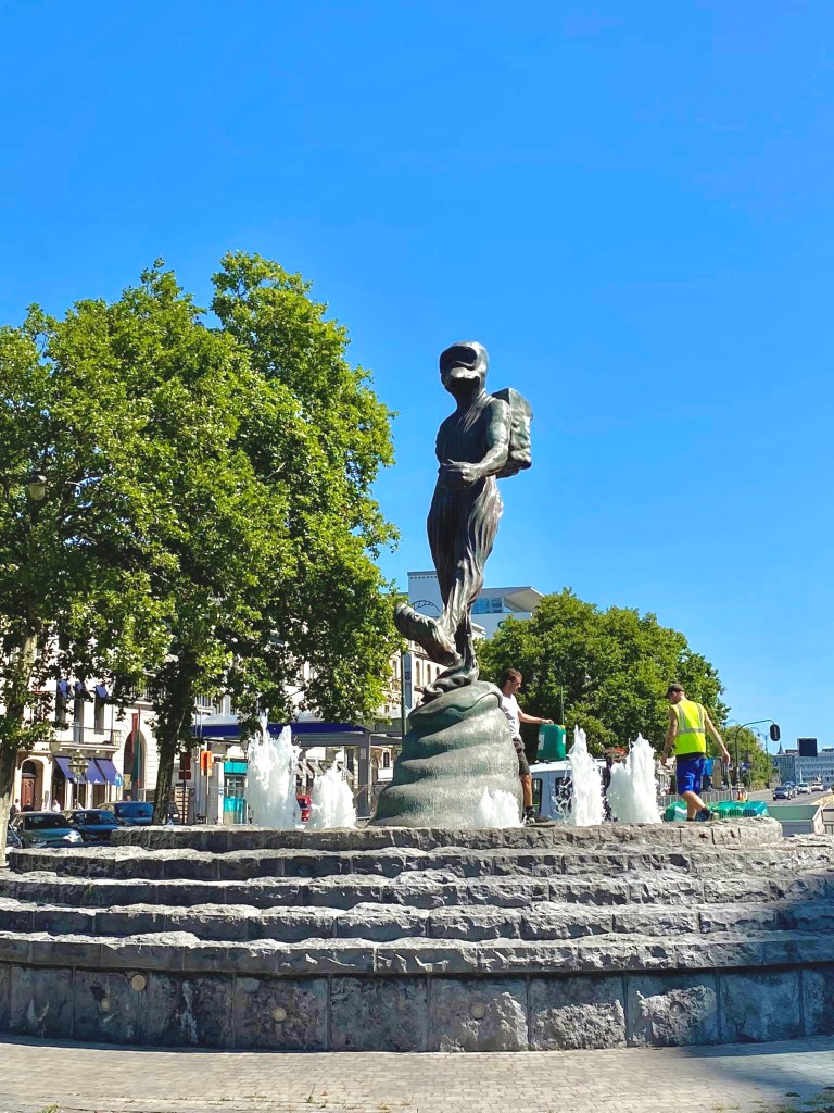 The Man From Atlantis is a unique sculpture surrounded by a fountain. The piece was installed in 2003 by sculptor Luk Van Soom.
