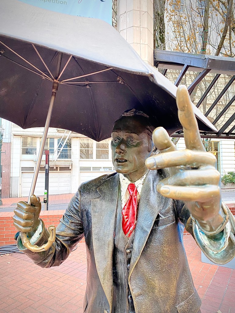 Umbrella Man” also called ‘Allow Me’ is a 1983 full scale bronze sculpture, located in Pioneer Courthouse Square. Some call him the most photographed man in Portland.