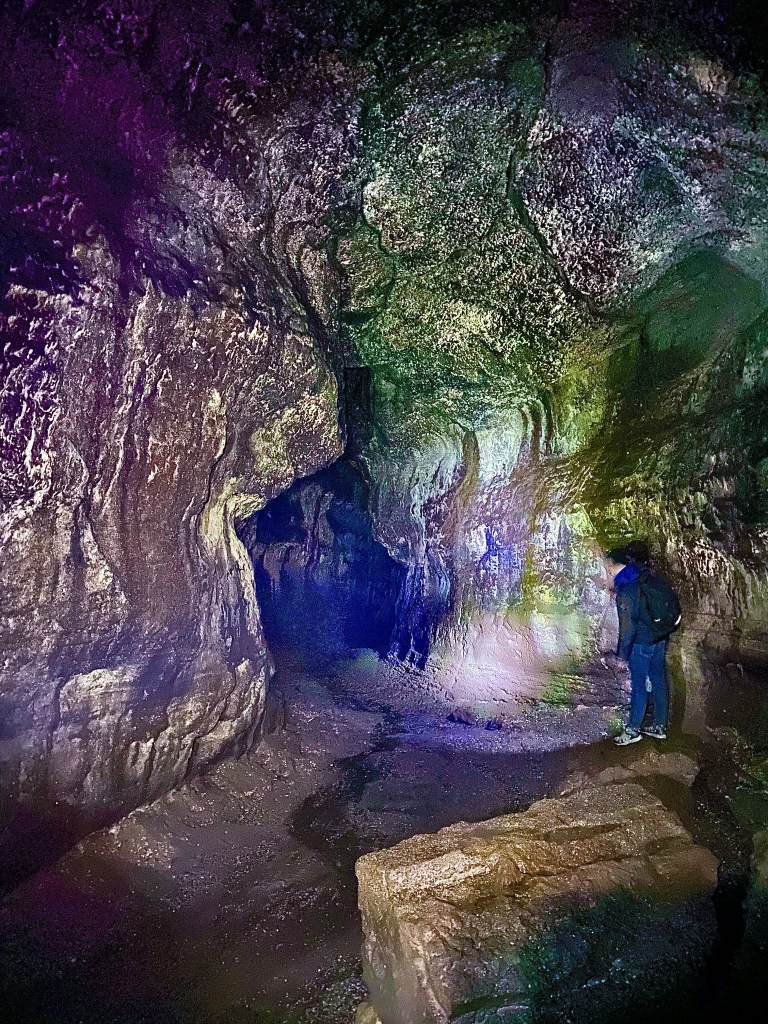 Note the cool and unusual geological feature stuck in the cave. A huge lava boulder called ‘The Meatball’ sits perched over a passageway, where it got stuck as lava flowed through the tube.