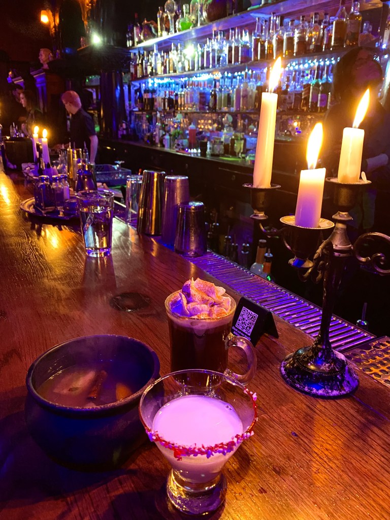 - The Cauldron and Co. – This lively theme potion-making shop have locations in London, Edinborough, New York, Philadelphia, and Brighton. It’s a popular destination for tourists and locals alike to book a full potions-making experience. The decor is inspired by traditional witchcraft, with dark wood and stone walls, candlelit tables, and a fireplace to keep you warm on cold winter nights. The menu features a variety of local beers, wines, and cocktails, as well as a selection of traditional Irish dishes.