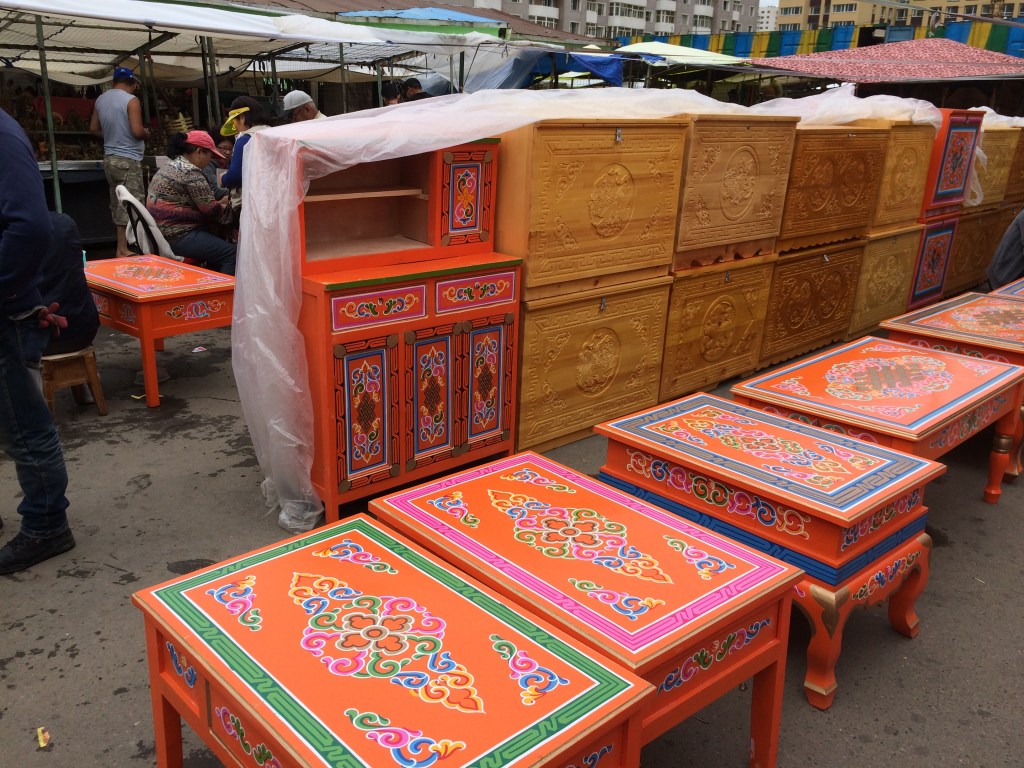 As I continued down the crowded aisle, I came across a booth filled with hand-painted Mongolian furniture. These pieces are truly one-of-a-kind, with intricate patterns and designs that reflect the vibrant culture of this fascinating country. I am tempted to buy a piece for myself, but decide to hold off for now and continue exploring.