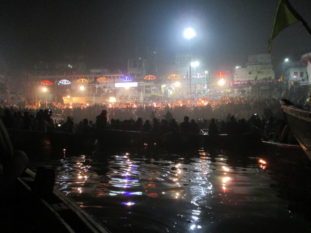 Every night on the banks of the Ganges River the Aarti ceremony takes place. The Aarti ceremony is held on the Dashashwamedh Ghat in Varanasi, India. This ceremony of lights is a Hindu practice involving the waving of lighted lamps in circles three times in a clockwise direction while chanting a prayer or singing a hymn. This practice is the greeting and thanksgiving of the River Goddess Ganga.
