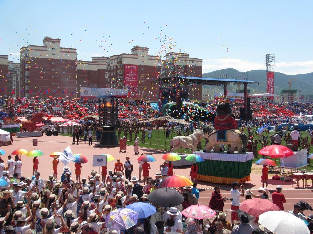 Naadam Festival is a Mongolian national festival celebrated annually in mid-July. Events are held all around Mongolia but the largest and opening ceremonies are at the National Stadium in Ulaanbaatar, Mongolia. The festival centers around three main national sporting events: horse racing, wrestling, and archery. The most elaborate part of the festival is the opening ceremonies which incorporates parades, music, storytelling, dancing, fireworks, waterworks, and acrobatics. The celebration also attracts celebrities, diplomats, and religious figures as its one of the largest celebrations of the year.