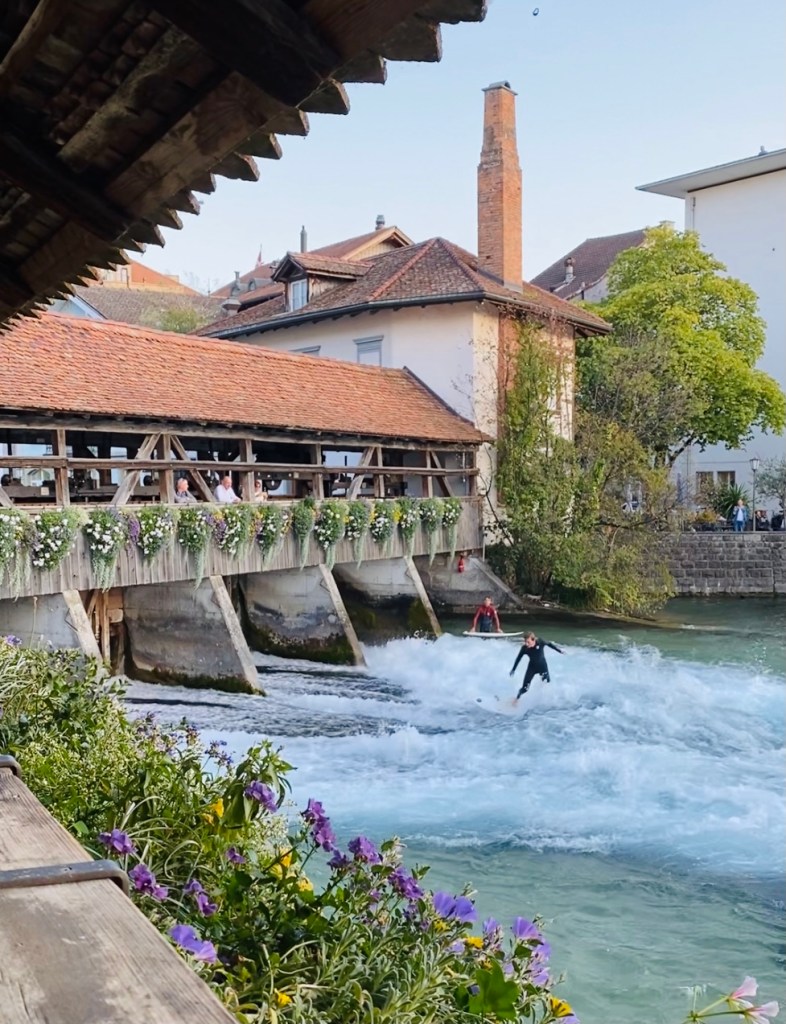 Known as River Surfing, this unusual pastime is popular since the landlocked country lacks ocean waves. The river Aare River runs at the perfect surfing pace through the Mühleschleuse wooden sluice bridge (river dam).