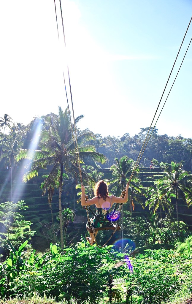 Amongst the deep green and lush rice-terraced valleys in Ubud are countless massive swigs that allow visitors to swoop out over the steeped vista for a spectacular view.